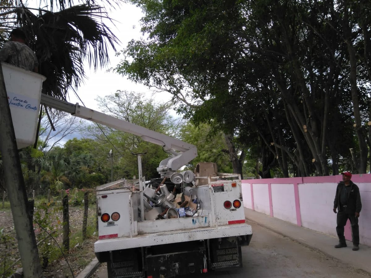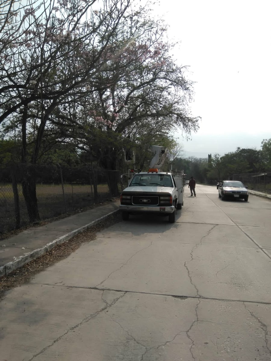 Personal de Servicio Públicos trabaja en el desrame, aclarado y colocación de luminarias en la calle Manuel Doblado y Felipe Ángeles, calles que se encontraban muy oscuras.